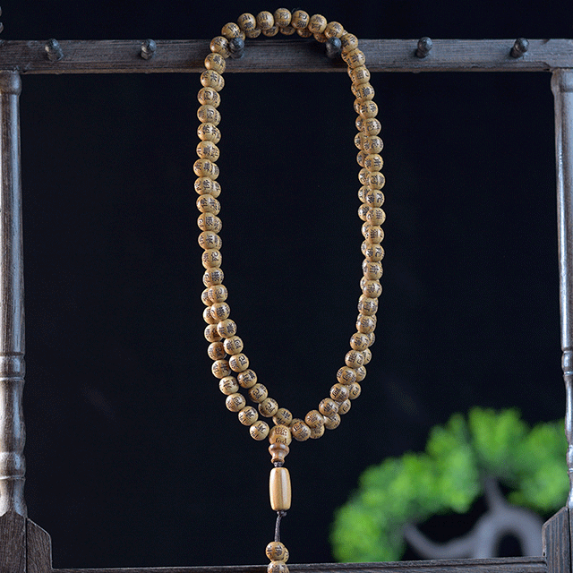 Vintage 降龙木 (Dragon-Subduing Wood) Six Paths Wood Buddhist Prayer Beads, Exquisitely Carved with Characters, 108 Beads, Handheld Collectible Bracelet/Wristband, Handheld